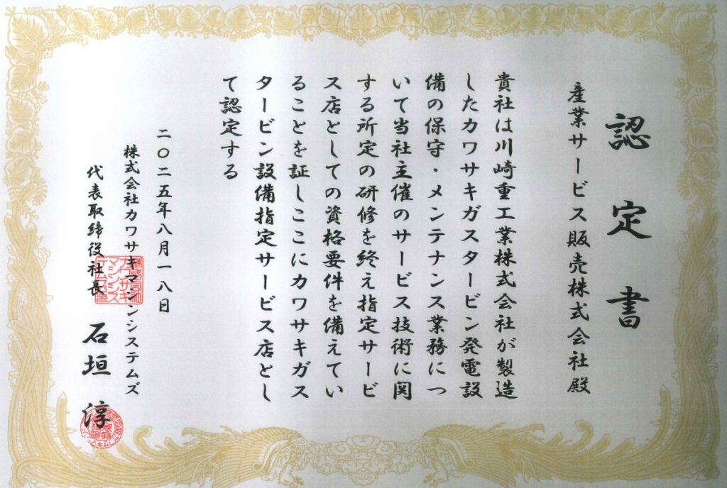 このたび、弊社は 株式会社カワサキマシンシステムズ様より「カワサキガスタービン設備指定サービス店」の認定書 を賜りました。