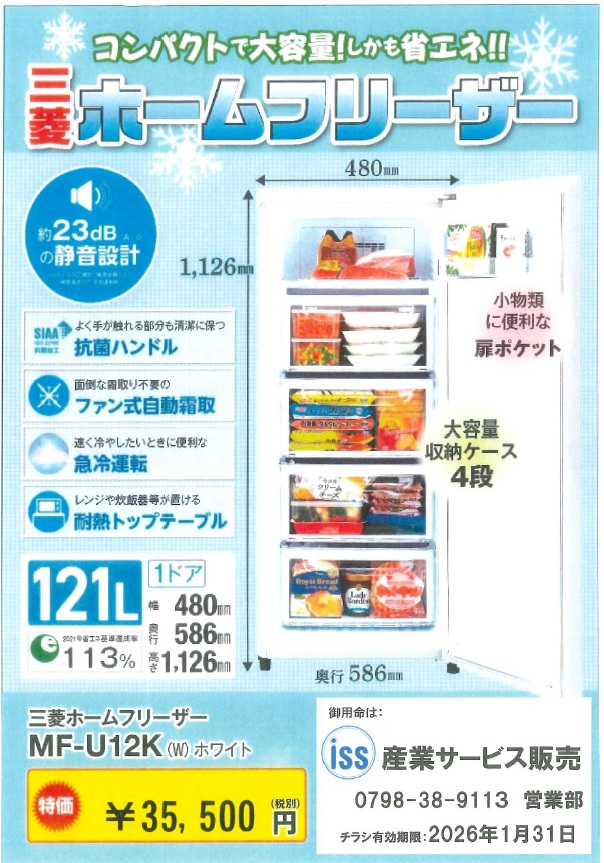 三菱ホームフリーザー(MF-U12K)を今年2026年1月30日まで特価35,500円で提供します。